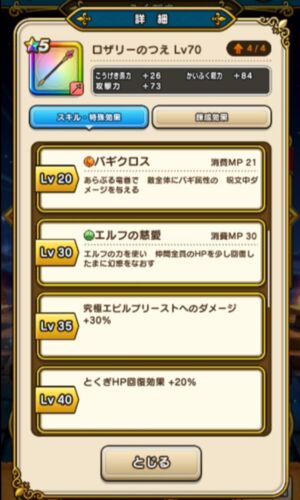 ロザリーの杖の錬成が解禁されました。 ロトの剣に続く錬成なので、今回はその内容を見ていきたいと思います。 ロザリーの杖の性能と評価 ロザリーの杖は回復の杖です。 回復の杖には、さとりの杖やら聖風の杖があり、求められる回復量は200以上です。 ロザ…