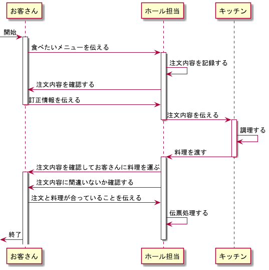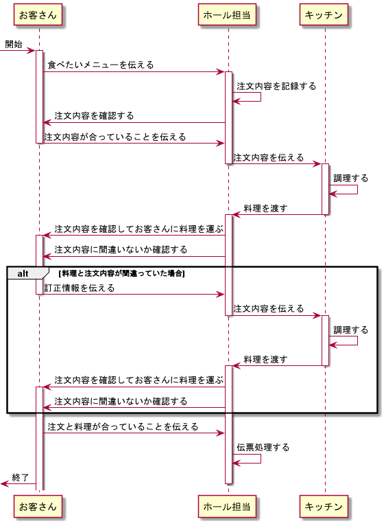 @startuml participant "お客さん" as Customer participant "ホール担当" as Hole participant "キッチン" as Kitchen [-> Customer:開始 activate Customer Customer -> Hole :食べたいメニューを伝える activate Hole Hole -> Hole:注文内容を記録する Hole -> Customer:注文内容を確認する Customer -> Hole:訂正情報を伝える deactivate Customer Hole -> Kitchen:注文内容を伝える deactivate Hole activate Kitchen Kitchen ->Kitchen:調理する Kitchen -> Hole:料理を渡す deactivate Kitchen activate Hole Hole -> Customer :注文内容を確認してお客さんに料理を運ぶ activate Customer Hole -> Customer:注文内容に間違いないか確認する Customer -> Hole:注文と料理が合っていることを伝える Hole -> Hole:伝票処理する Customer ->[:終了 deactivate Hole @enduml