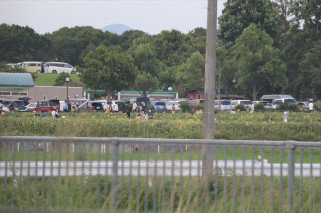 着く前から結構もうひまわりでした。 写真で頑張って撮ったんですけど、少しは伝わるんだろうか。 午後3時くらいだったんですけど、駐車場は満車で人もたくさんいました。