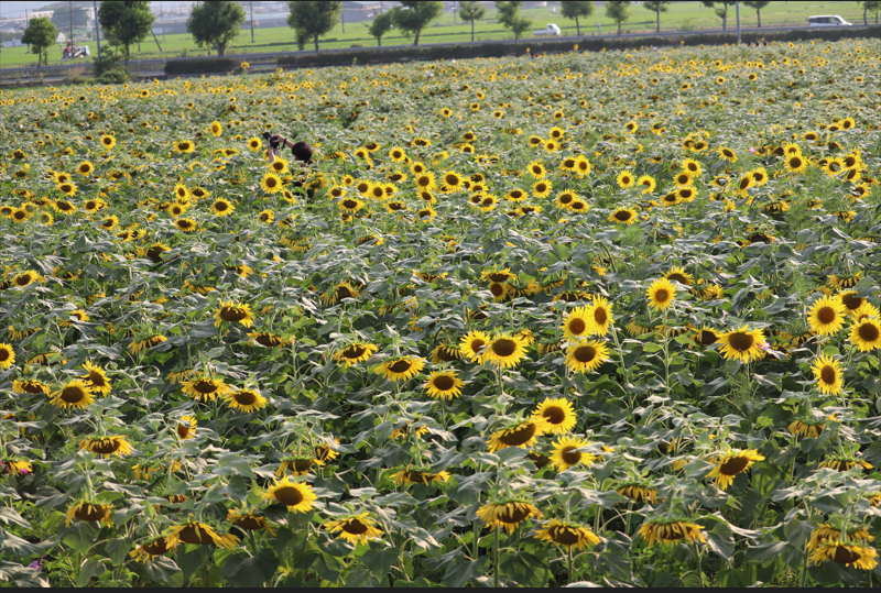 ひまわり畑ということもあってひまわりですね。 一面のひまわりで全部で何本くらいあるんだろう。 それにしても、面白いくらい同じ方向を向いていますね~。 昼下がりだったので一部のひまわりはうつむき加減になっちゃっていますが。