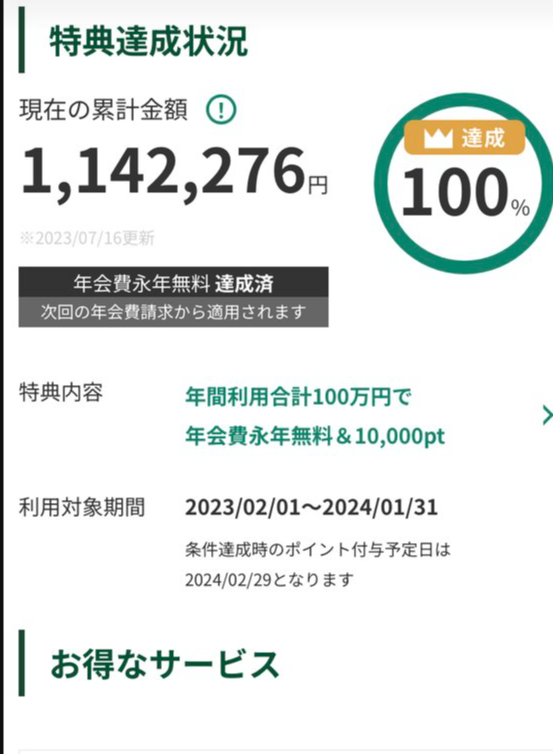 100万円を使うと翌年以降の年会費が永年無料になるわけですが、