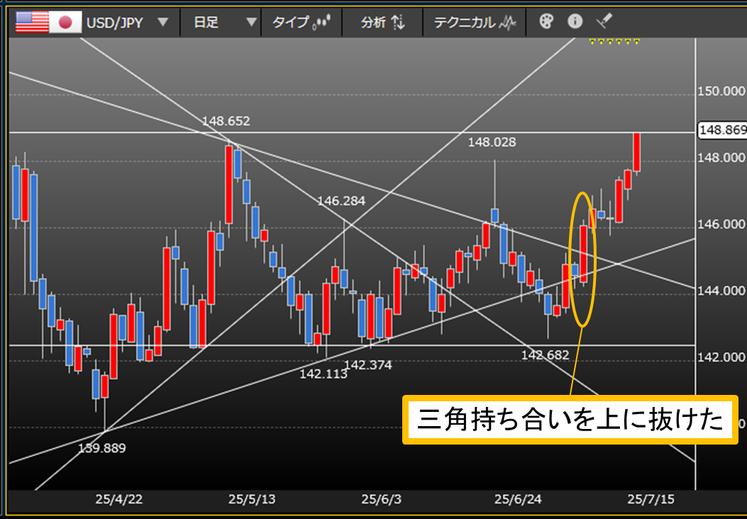 最近のところはいわゆる三角持ち合いで上に抜けたパターンで一気に上昇しています。