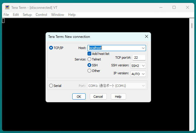 teratermからlocalhostにて接続します。